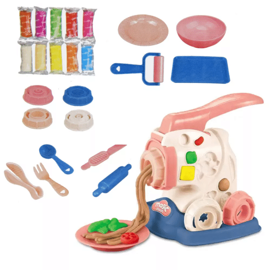 A szett rengeteg kiegészítőt tartalmaz, köztük evőeszközöket, tányérokat, és mintázókat, valamint egy szuper tésztanyomó gépet is. A játék 3 éves kortól ajánlott.